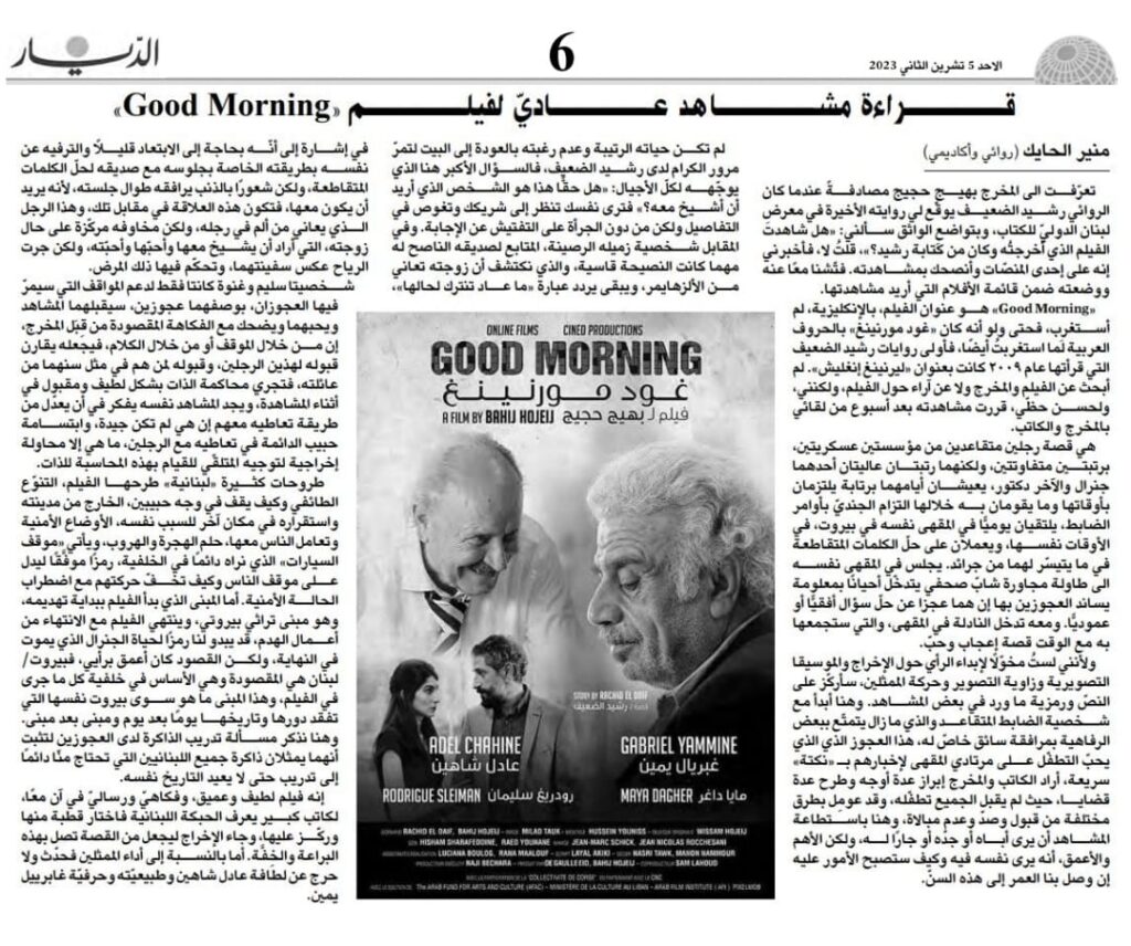 “Good Morning” هو عنوان الفيلم، بالإنجليزية، لم أستغرب، فحتى ولو أنه كان “غود مورنينغ” بالحروف العربية لَما استغربتُ أيضًا، فأولى روايات رشيد الضعيف التي قرأتها عام 2009 كانت بعنوان “ليرننيغ إنغليش”. لم أبحث عن الفيلم والمخرج ولا عن آراء حول الفيلم، ولكنني، ولحسن حظّي، قررت مشاهدته بعد أسبوع من لقائي بالمخرج والكاتب.